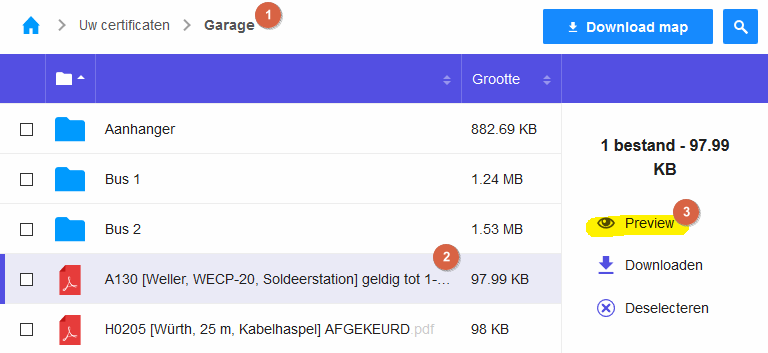 Na een klik op een certificaat (2) verschijnt rechts een keuzemenu, klik op Preview (3) om het certificaat online in te zien. Hier kunt u ook het geselecteerde certificaat downloaden naar uw eigen administratie.