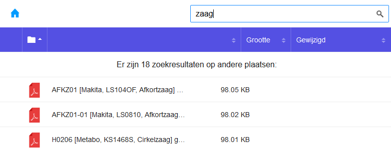 Klik op de zoekknop en type uw zoekopdracht: typen van “zaag” in het voorbeeld hieronder geeft u alle [Decoupeerzaag, Afkortzaag, Cirkelzaag, …]. Klik vervolgens op een van de zoekresultaten om naar de vindplaats (locatie/afdeling) te gaan.